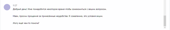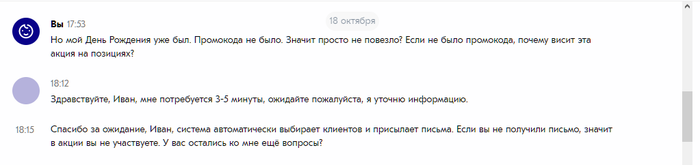 Свой промах безусловно есть, в смску все правила акции не втиснешь, а я о ситуации узнала уже постфактум. Пока искала информацию об этой акции, наткнулась на поток подобных же обидок: кому-то про персональный купон сотрудницы стойки "Информация" не разъяснили, и скидка не прошла, кому-то не провели скидку на определенный товар просто по велению правой пятки кассира, когда на сайте в правилах черным по белому: на что не предоставляется скидка, и на что не суммируется.