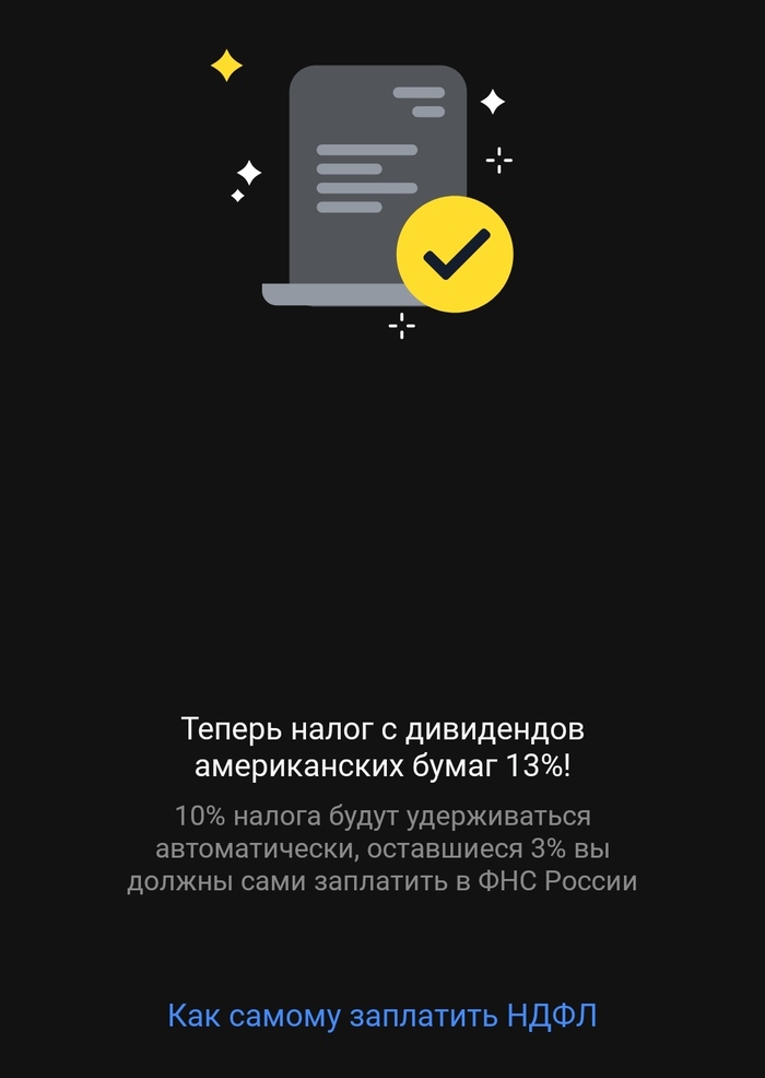 4. Подпишите форму W-8BEN. Для тех кто хочет торговать акциями США и платить меньший налог (не 30 а 13 процентов). Как проверить? Для клиентов брокера Тинькофф: Приложение – Еще – Профиль – Форма W-8BEN. Должно быть написано: Форма принята, теперь налог с дивидендов 13 процентов, 10 процентов налога удерживаются автоматически, 3 процента вы сами должны заплатить в ФНС РФ.