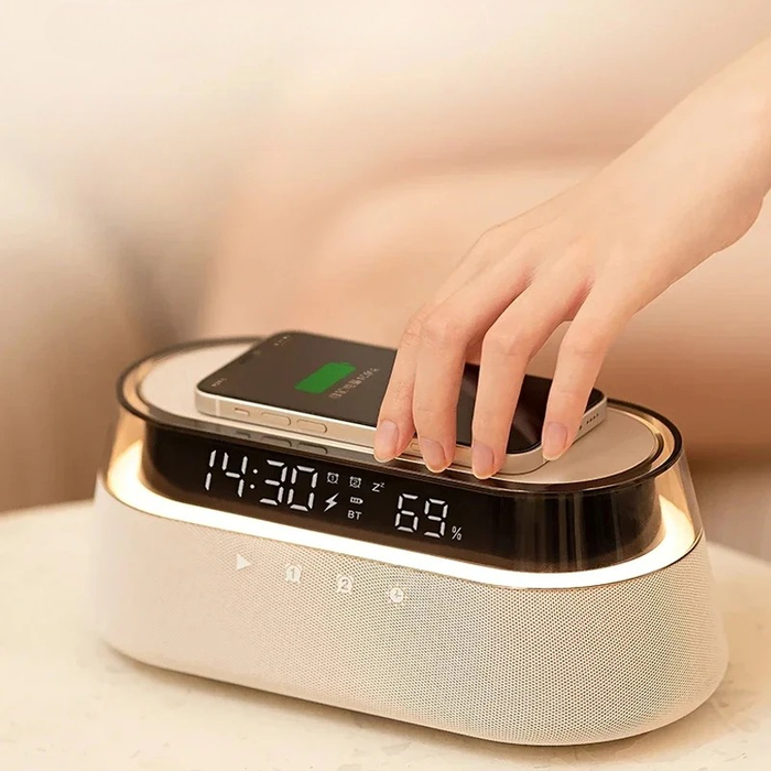 Настольные часы с беспроводной зарядкой объединяют в одном корпусе сразу несколько функций: зарядка смартфона мощностью 15 Вт, двойной будильник и портативная колонка с поддержкой Bluetooth. Беспроводная зарядка срабатывает просто — положил телефон сверху, и батарея пополняется без кабеля.