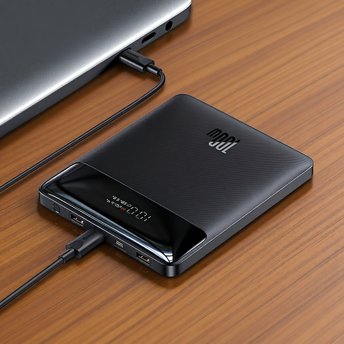 Внешний аккумулятор с толщиной 12 миллиметров и весом 260 граммов легко помещается в карман рубашки или боковой отсек рюкзака. Ёмкость 20 000 мАч хватает, чтобы зарядить смартфон три раза или планшет полностью. Поддержка быстрой зарядки на 100 Вт означает, что флагманский телефон дойдёт до 80% примерно за 25 минут.