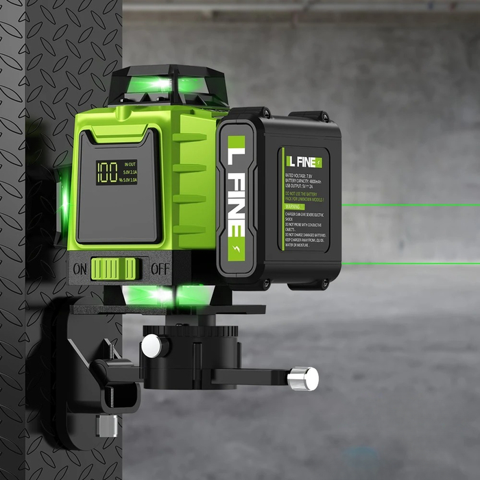Лазерный уровень с углом обзора 360 градусов автоматически выравнивается при включении, без ручной настройки. Зелёный луч видно лучше, чем красный, даже при ярком естественном свете в комнате. Точность составляет 1 мм на расстоянии 7 м, что достаточно для развески полок или укладки плитки.