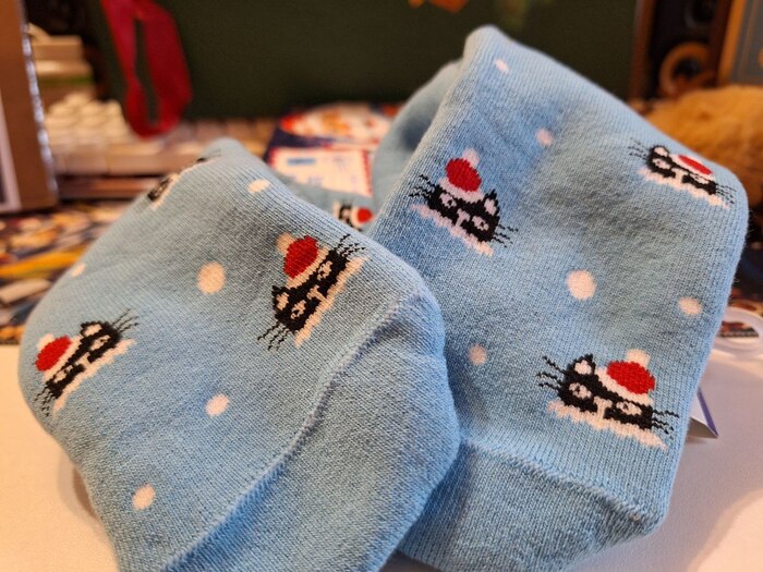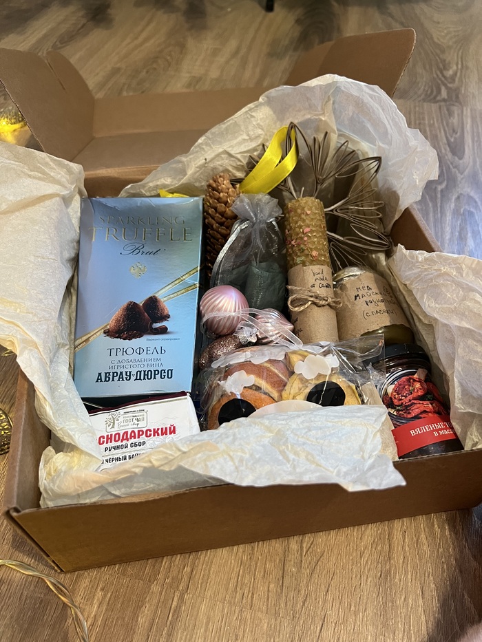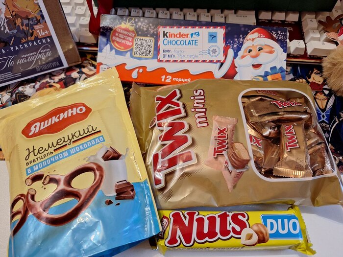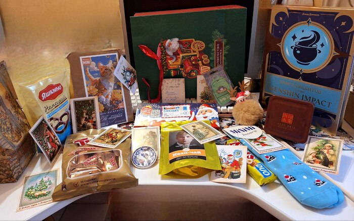 Тут и носочки, игра для сына, украшение для младшей, новогодние подставки под кружки, сладости, книга с рецептами татарской кухни, детективчик, ежедневник, колбаса))