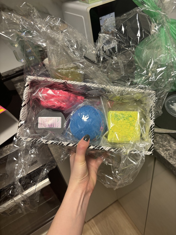 Была ещё коробочка, когда открыли, то сразу не поняли что это...подумали, может, мыло ручной работы...но аромат был потрясающий и как будто бы съедобный)))) решили попробовать... и да, это какой-то десерт))) сливочный с фисташками вроде))) ооочень вкусный.