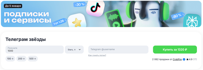 Один из самых быстрых и при этом бюджетных вариантов — взять звезды через ggsel. Это площадка, где разные продавцы выставляют валюту по своим ценам, и часто выходит заметно выгоднее, чем через другие способы. Вам не придется заморачиваться со способом оплаты в случае покупки через приложение: обычно все делается за несколько минут, а оплатить можно обычной российской банковской картой или через СБП.
