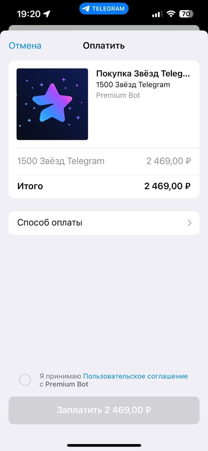Также можно оплатить через десктопную версию, обычной банковской картой. После первой покупки, дальнейшее приобретение звезд возможно через «Мои звёзды» в настройках Telegram.