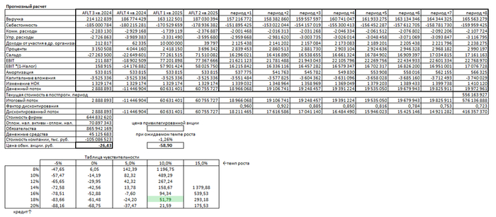 3. Далее нам нужно рассчитать все будущие денежные потоки компании (доходы за вычетом расходов и инвестиций), привести их к текущей стоимости с помощью WACC (17,63%) вычесть обязательства и разделить на количество акций. В результате мы получим стоимость одной акции Аэрофлота.