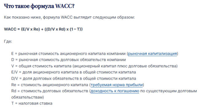 2. Теперь рассчитаем средневзвешенную стоимость капитала (WACC) из переменных которые мы выбрали под Аэрофлот. WACC — это минимальная доходность, необходимая для оправдания вложений в компанию с учетом всех рисков.