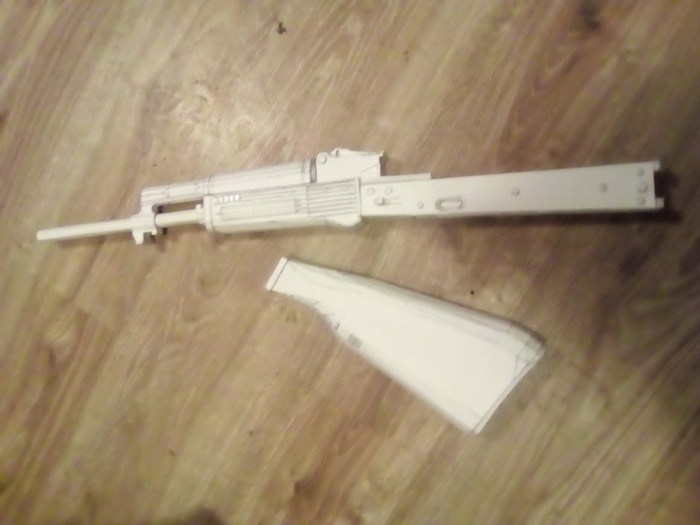 С прикладом, кстати произошла заминка. В оригинальной развертке был складной рамочный. Мне же хотелось монолитку... После долгих прочесываний интернета, ничего точного не нашел, решил стридешничать и развернуть сам. Вот что получилось.