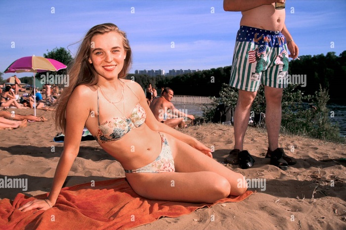 Девушка отдыхает на московском пляже, 1998 год.
