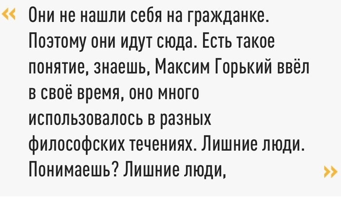 «И при этом социальный уровень у них не предусматривает что кто-то из них станет академиком. <…> Раз лишние люди, значит, этими людьми можно рассчитаться в войне за то, чтобы просто вымотать противника максимальным образом. Собственно, даже тут нет ничего нечестного или подлого — с этими людьми расплачиваются. С этими людьми расплачиваются более или менее щедро деньгами, да? С ними рассчитываются орденами и медалями. Может быть, не так густо, как в армии, но рассчитываются <…> Это не обман, в принципе, да?» — говорит он.