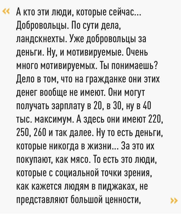 «Их задача, на самом деле, пока где-то в тылу готовятся к направлению главному, максимально оттягивать на себя внимание и максимально изматывать живую силу противника. <…> Это просто живая сила, которая идет в расход. <…> Более того, как ты понимаешь, над этим думают не только генералы, но и те люди, которые сидят в других кабинетах, где гражданские пиджаки. И они смотрят просто на социальный состав. А это кто? Кто эти люди, которые идут сейчас в добровольцы? Ну, по сути дела, ландскнехты, да. Уже добровольцы за деньги», — говорит Бородай.