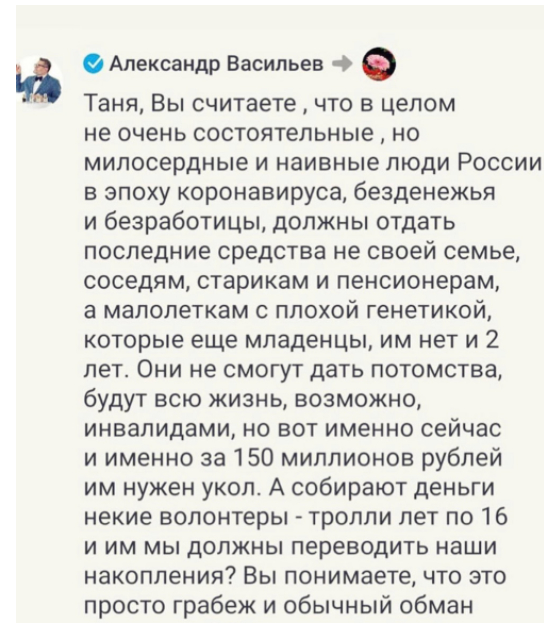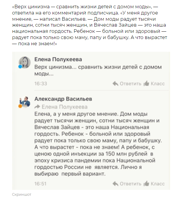Шумиха поднялась знатная, тем интересней следующая информация об Алексадре Васильевом, хоть и полуторогодой давности, где он возмущался тем, что онкобольным детям собирают "всем миром", а его другу Славе Зайцеве не помогли.