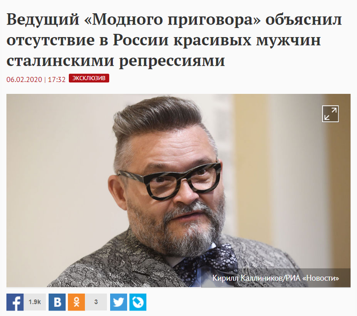 Историк моды и ведущий передачи «Модный приговор» Александр Васильев согласился со словами Жана-Поля Готье о том, что в России не встречается красивых мужчин-моделей. По его мнению, причина этого кроется в сталинских репрессиях.