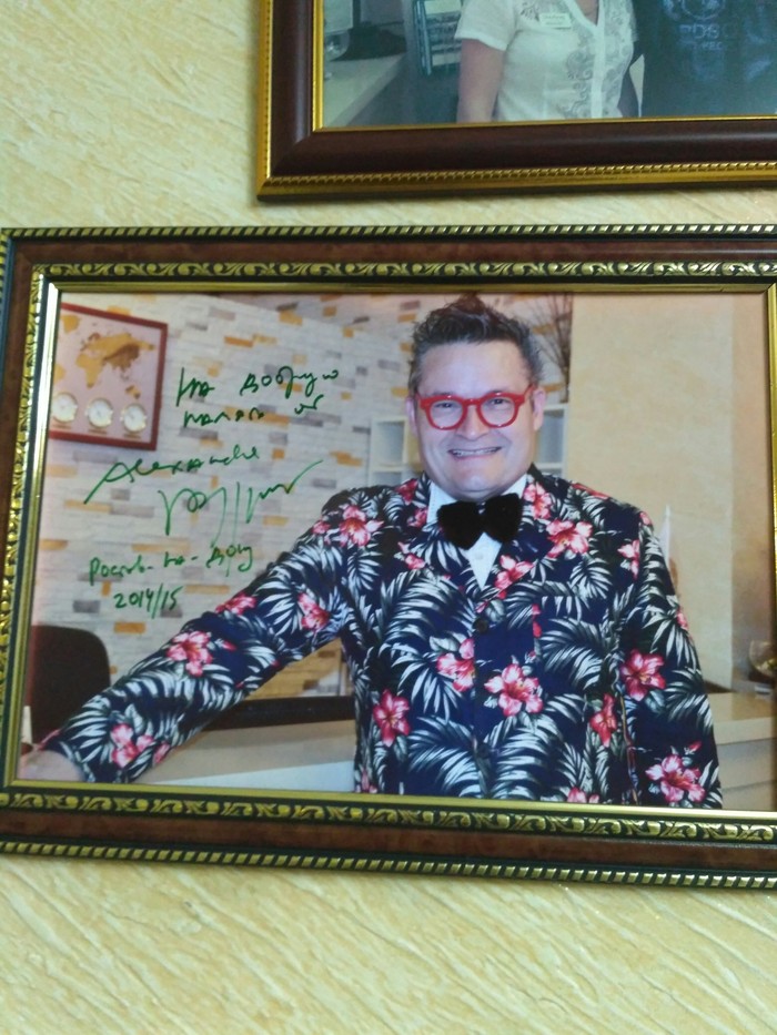 В начале декабря 2017г. закинуло меня в Ростов-на-Дону. Остановился в одном вполне таком респектабельном отельчике. Как и во многих отелях, его стены были завешаны фотографиями знаменитостей, когда-либо останавливающемися в данном отеле, с автографами и словами благодарности. Меня привлекло фото одной очень знакомой личности, но я никак не мог вспомнить, кто же это: