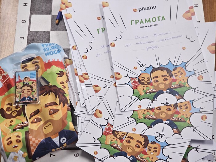 И, конечно же, выражаю благодарность руководству шахматной школы "Олимп" https://schoololimp.ru! Благодаря их помощи удалось пригласить самого Грищука. А это было непросто! Они были готовы подстраховать с инвентарем, если бы пришлось проводить турнир не на шахматной площадке. И именно там работает наш победитель, @kartviller, а вместе с ним и другие лучшие тренера Москвы. Если вы хотите подтянуть свои шахматные навыки или отдать ребенка заниматься, лучшего места не найти! Я сам там некоторое время занимался и буквально за несколько месяцев вырос примерно на 150 пунктов, плюс получил серьезное фундаментальное понимание многих неочевидных без тренера вещей. Так что могу с чистой совестью рекомендовать эту школу, там здорово.