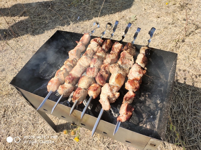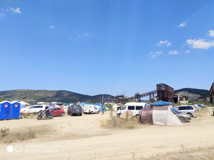 Когда приехали нас уже ждали, для нас было уготовано парковочное место, скинулись на еду, нажарили шашлыка. Алкоголя было много-5л баклаха коньяка, но мы не увлекались. На таком пекле как у нас в августе пить не лучшее занятие)))))Мы сразу же впряглись в организацию и полезные дела, собрали мангал. Друг ,собирая мангал, случайно порезал себе палец ,кровищи было как с кабана, бинтовали.