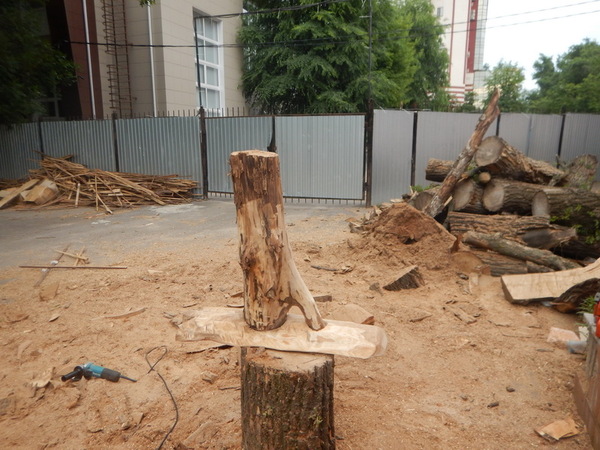 Мне выпала редкая удача. Центр города. Заброшенный сквер у старой сцены Камерного театра. 5-6 кубов вяза, который срезали на улице Кольцовской в рамках «санитарной рубки». Я, конечно, не специалист. Я не знаю, зачем их срезали. Отличные деревья! Одной половине меня их очень жаль. Но вторая ликует при мысли о том, что эти деревья удалось спасти от обычной участи – вывоза на свалку. И притащить в этот сквер.