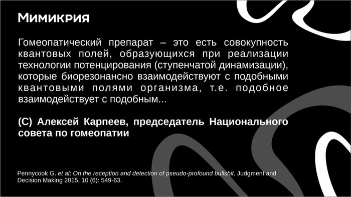 Но не только скрытые гомеопаты так делают, пытаются мимикрировать под науку на таком более высоком уровне. Например, те же гадающие по отпечаткам пальцев, подобно тому, как в научпопе принято приводить ссылки на литературу, они тоже приводят ссылки на литературу, подтверждающую эффективность этих гаданий. Но на самом деле часто они ссылаются на работы, которые не имеют никакого отношения к этим тестам.