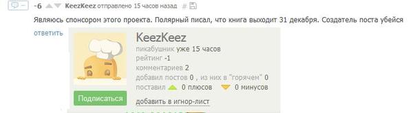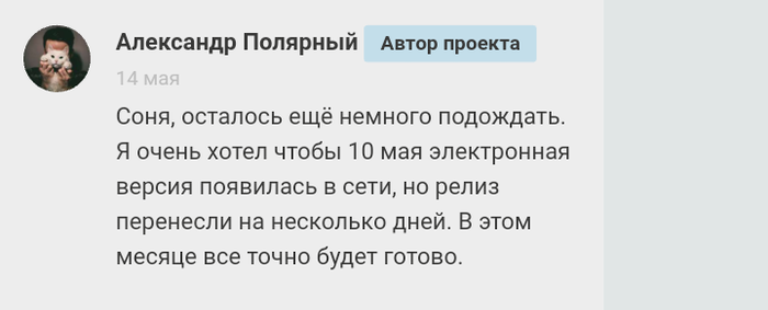 24 августа автор опубликовал свой последний пост с обещаниями скоро выпустить книгу. С тех пор страница проекта на Бумстартере молчит, а автор изредка пишет в комментариях, что готов кому-то из просящих вернуть деньги (которых стало больше вчера-сегодня и ниже объясню, почему):