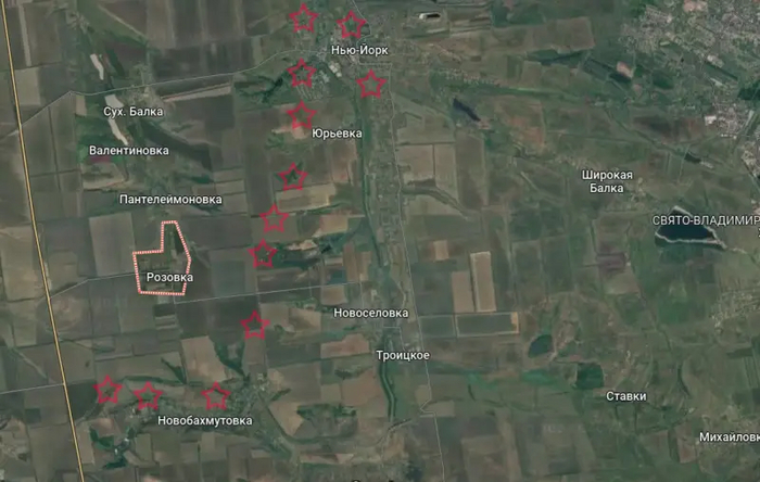 Наступая вне населённых пунктов на этом направлении, Вооружённые силы России значительно продвинулись с востока от Александрополя (Розовки, не путать с ранее освобождённым селом в ЛНР). Это населённый пункт, располагающийся юго-западнее Нью-Йорка (Новгородского). Через него проходит несколько дорог, включая дорогу на Сухую Балку, через которую идёт снабжение ВСУ в Нью-Йорке.