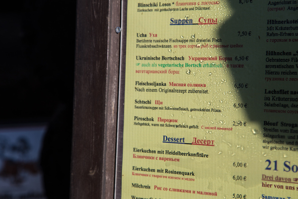Есть тут и этнический ресторан с Бабой Ягой и русскими блюдами. Обратите внимание на написание слов "щи" и "борщ" - 7 и 8, соответственно, согласных подряд! Должен заметить, что щи, борщ и солянка - крайне популярные в Германии, регулярно встречаются в кафе на заправках и всяких фуд-кортах (ресторанных двориках).
