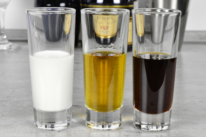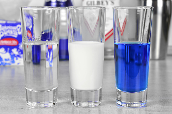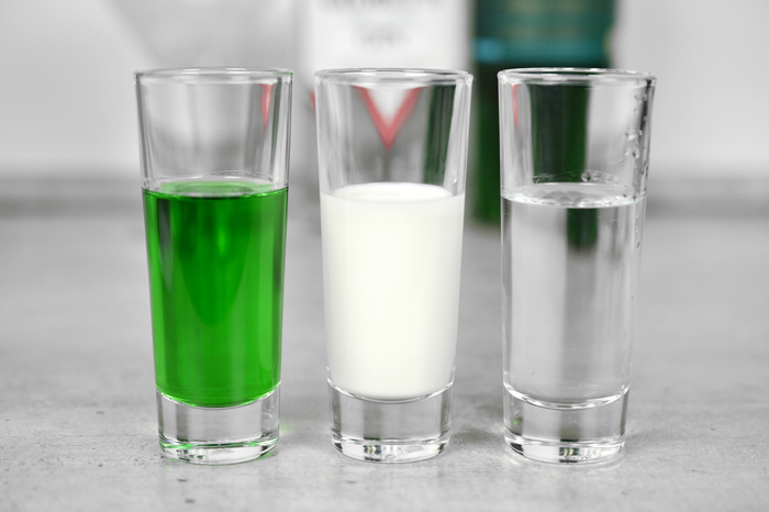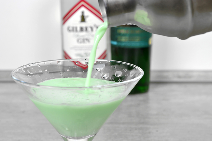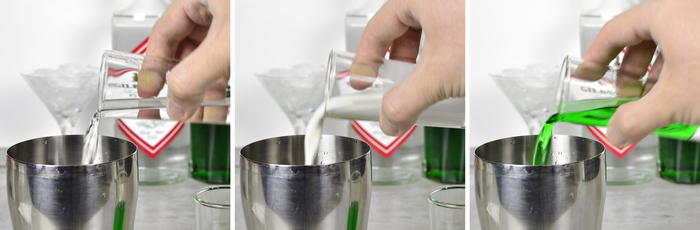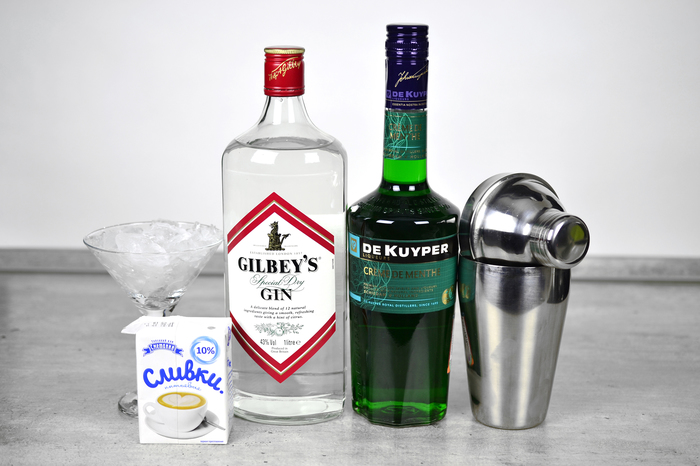 Отмеряем по 30 мл мятного ликера, сливок и джина: