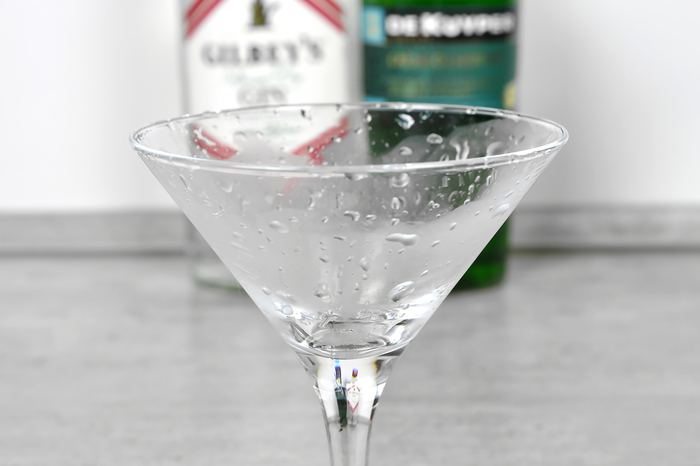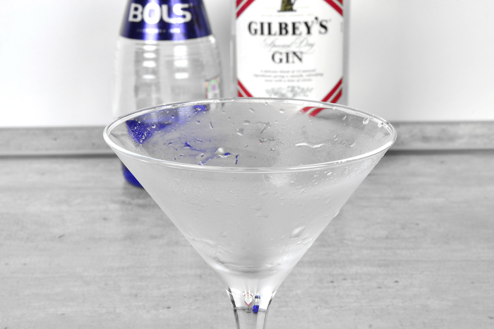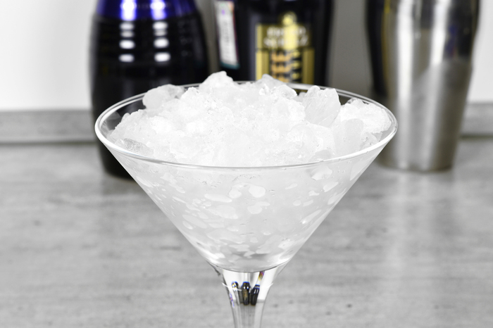 Закидываем в коктейльный бокал лед для его охлаждения. Закидываем в шейкер лед.