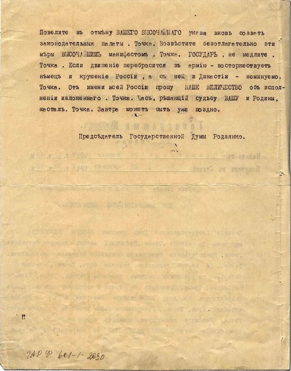 Занятия Государственной думой указом Вашего величества прерваны до апреля. Последний оплот порядка устранен. Правительство совершенно бессильно подавить беспорядок. На войска гарнизона надежды нет. Запасные батальоны гвардейских полков охвачены бунтом. Убивают офицеров. Примкнув к толпе и народному движению, они направляются к дому Министерства внутренних дел и Государственной думе. Гражданская война началась и разгорается. Повелите немедленно призвать новую власть на началах, доложенных мною Вашему величеству во вчерашней телеграмме.