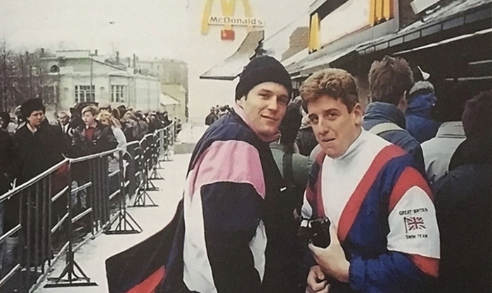 Джейсон Стейтем с товарищем в очереди в первый МакДональдс в Москве, 1990 год.