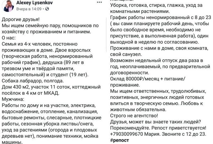 Любопытная вакансия появилась для трудолюбивых и, главное, нетребовательных людей. Алексей Лысенков, бывший ведущий некогда популярной программы "Сам себе режиссер" ищет двух помощников по хозяйству. Условия просты и понятны: работа (много), оплата (80 тысяч рублей на пару) и две недели неоплачиваемого отпуска в год.