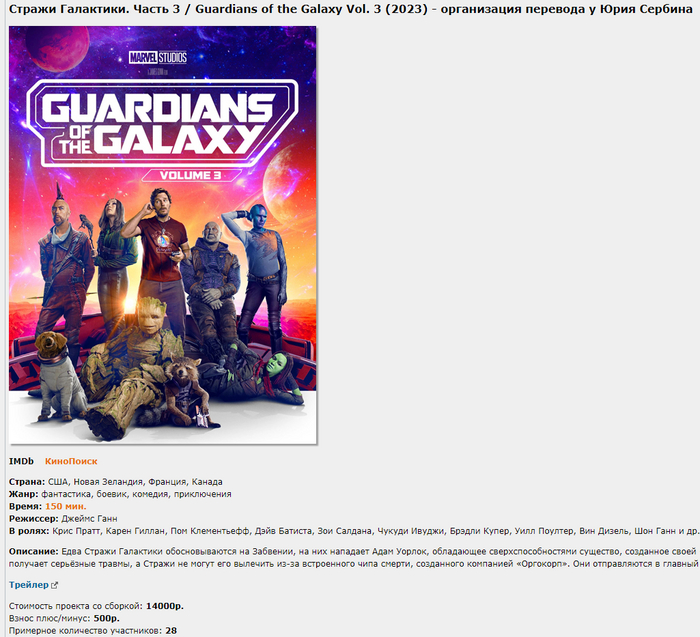 Все же не дело собирать 14к на озвучку Стражей галактики 3. Ладно бы были живы Михалев и Володарский, которые могли сделать смешно и лампово или Пучков еще, но Сербин тут это одноголоска ради одноголоски и не более.