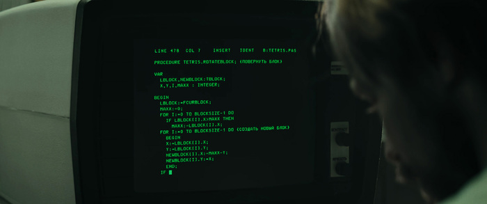 Более того, в следующей сцене на экране того же компьютера работает совсем другая версия Тетриса — его вариант, адаптированный программистом Вадимом Герасимовым для машин семейства IBM PC.