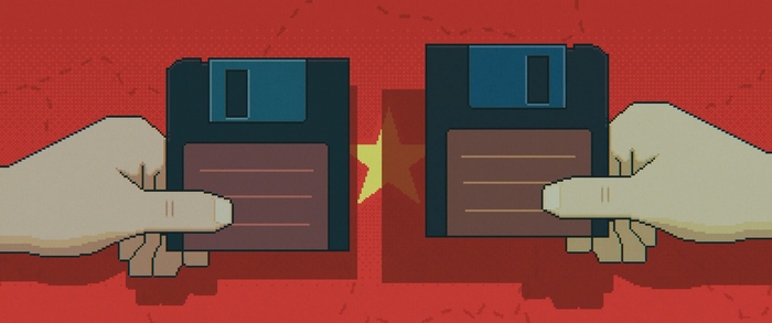 По проводам тогда компьютеры ещё не соединялись. У PC даже, по-моему, не было последовательного интерфейса. Или он был, но ни у кого не было драйверов. Между компьютерами стояла глухая стена. Если нельзя даже текст перенести, не буду же я заново набивать полторы тысячи строк «Тетриса».