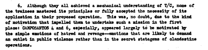 “Хотя все новобранцы освоили основы техники Т/С*, никто из них не постиг ее принципы или не убедился в необходимости ее применения в их будущей операции. Причина этого, вероятно, кроется в мотивации, которая побудила их к этому: в особенности, CAMPOSANTOS 4 и 6**, по-видимому, действовали под влиянием таких примитивных эмоций, как ненависть и жажда мести – эмоций, которые скорее толкают к открытому насилию, чем к тонким операциям в глубокой тайне."