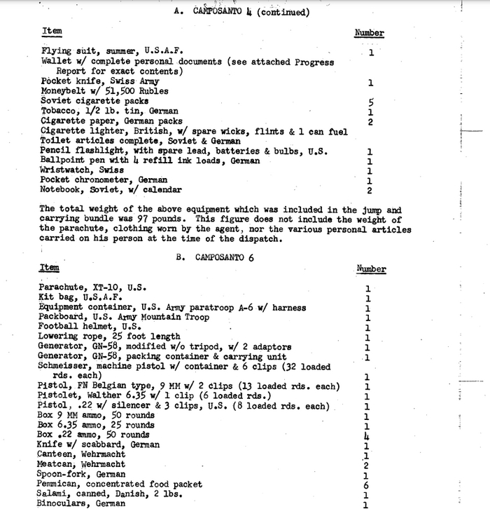 В подробном отчете о подготовке этой же группы от 29 сентября 1952 года приводятся легенды агентов, а также полный список снаряжения и оружия, с которым им предстоит десантироваться на территорию СССР. Например, агенты были снабжены советской одеждой, которая подтверждала легенду конкретного агента.