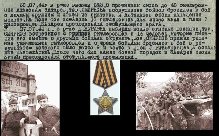 20 июля 1944 года в районе высоты 283.0 противник бросил в атаку до 40 бойцов. Смирнов бросился в бой с личным оружием, воодушевляя товарищей, тем самым отбив атаку. В том бою немцы потеряли 17 солдат, а сам он лично взял в плен семь человек. Через неделю, в районе деревни Журавка, выбирая новые огневые позиции, сам он и трое его однополчан столкнулись с группой противника из 16 человек. Немцы попытались взять советских солдат в плен, но те дали отпор, уничтожив 9 и взяв в плен пятерых. За личное мужество в этих боях он был удостоен ордена Славы III степени[6].