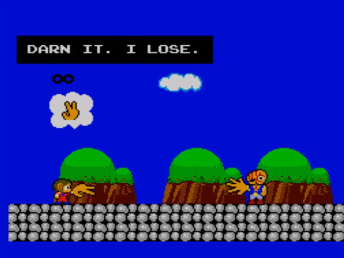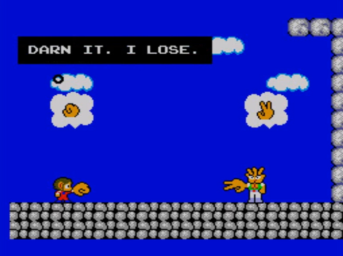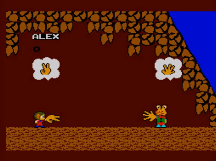 Имено в таком стиле боя Алекс Кидд сражается при первой встрече с самым первым боссом …