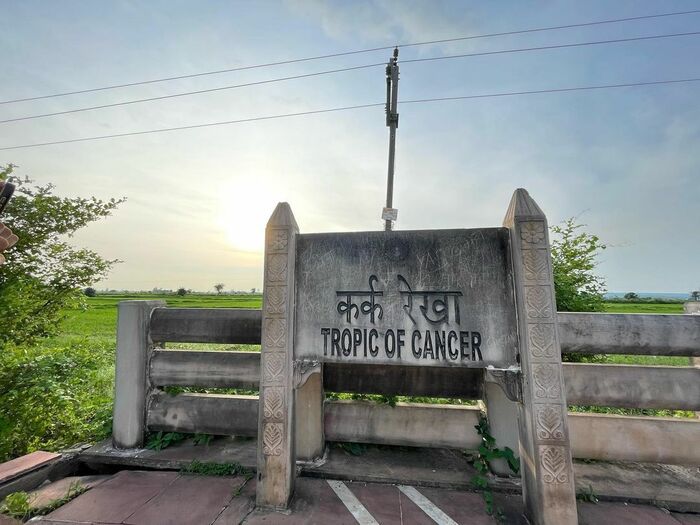 2. Индия. Тропик рака отмечен отмечен табличкой, например, здесь. Совсем недалеко расположен нацпарк Куно с множеством старинных фортов, где бродят тигры и гепарды.