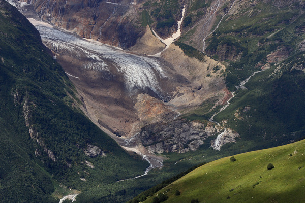 Алибекский ледник и одноименный водопад, сфотографировано с расстояния около 5 км. Август, 2015 г. Canon EOS 600D, Canon EF 75-300 mm.