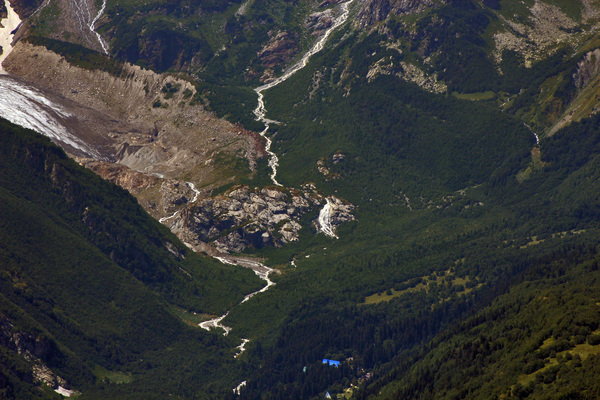 Алибекский ледник и водопад Алибек, сфотографировано с соседней горы Мусса Ачетара, с расстояния более 8 км. За мореной (справа от ледника) скрывается Турье озеро.