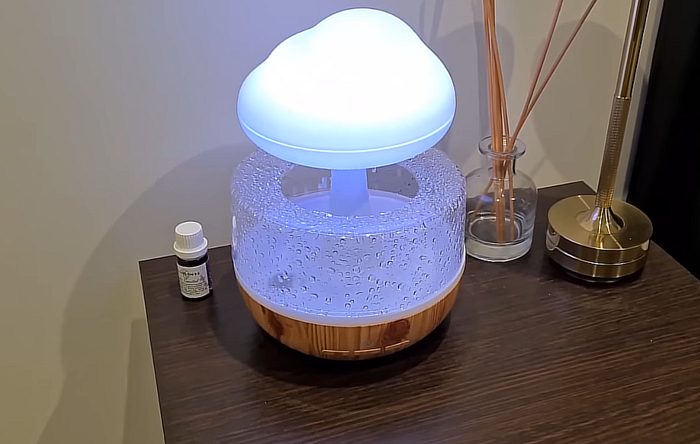 Тёплая подсветка облаков доступна в семи цветах и плавно меняется, дополняя эффект падающих капель и звуков дождя. Работает устройство от USB, а аккумулятора хватает до 15 часов непрерывного использования. В комплект входят пять ароматических масел на растительной основе, позволяющих подобрать настроение для сна, концентрации или релаксации.