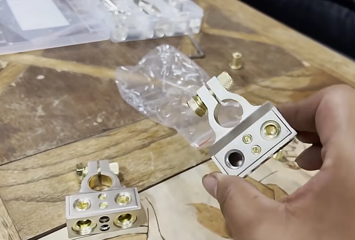 Аккумулятор оснащён двумя портами USB-C и одним USB-A, что позволяет одновременно заряжать несколько гаджетов. На цифровом дисплее отображается уровень заряда и текущая мощность. Прозрачный корпус демонстрирует внутренние компоненты — платы, элементы питания и кабели — создавая эффект технологичного дизайна.