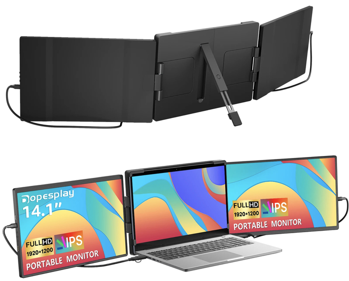 Тройной портативный монитор Dopesplay предназначен для расширения рабочего пространства ноутбука без стационарных экранов. Два дополнительных IPS-дисплея с разрешением 1200P обеспечивают комфортную работу с документами, кодом и графикой. Подключение через Type-C или USB делает систему универсальной для ноутбуков, MacBook, консолей и Switch. Конструкция рассчитана на экраны до 17,3 дюйма и складывается для транспортировки.