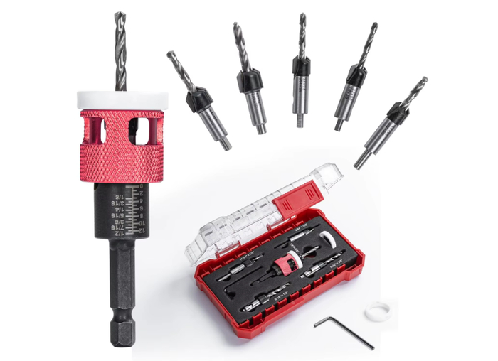 В комплекте предусмотрен удобный кейс с прозрачной крышкой, где все элементы имеют свои посадочные места. Благодаря этому хранение и транспортировка набора становятся максимально удобными. Встроенный шестигранный ключ позволяет быстро менять сверла и регулировать глубину зенковки без использования дополнительных инструментов.