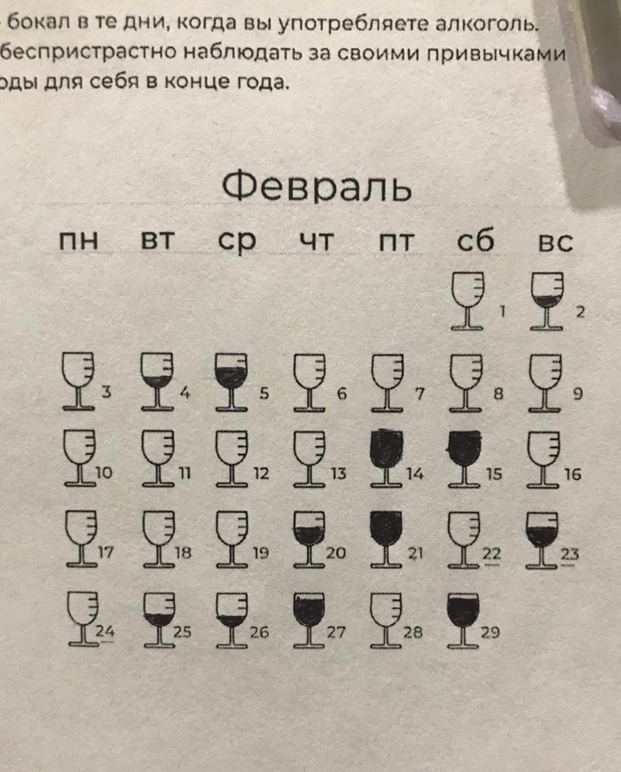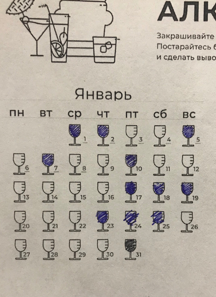 Сразу оговорюсь, что у меня никогда не было проблем с употреблением алкоголя, но в какой-то момент мне начало казаться, что дегустировать вино надо реже, чем два раза в неделю, плюс ещё сложились звёзды, и я начала пить антидепрессанты для борьбы с депрессией и тревожностью. И вот что мы имеем в итоге (31 декабря ещё закрасится, а в остальном всё как есть):