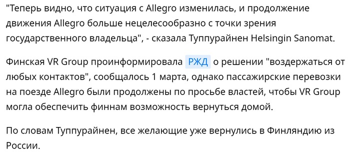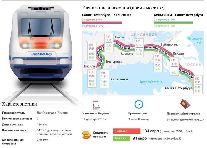 ХЕЛЬСИНКИ, 25 мар - РИА Новости. Поезд Allegro, курсирующий между Хельсинки и Санкт-Петербургом, прекратит работу в субботу из-за нецелесообразности, сообщает в пятницу газета Helsingin Sanomat.