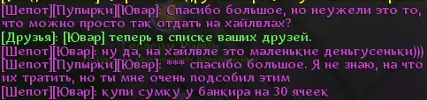 Я, естественно, спросил у Ювара, точно ли эту сумму он хотел дать, всё же деньги не малые - я к 10-у уровню только 1 золотой скопил, не тратясь ни на что особо. Ювар подтвердил, что это на его уровне - копейки. Я поблагодарил Ювара, сказав "я не знаю, на что тратить их", на что Ювар мне подсказал купить улучшенную сумку и сейф. Т.к. играем мы на подписочном сервере, эти улучшения можно купить за внутриигровую валюту, не прибегая к донату (доната на платных серверах вообще нет, напоминаю).