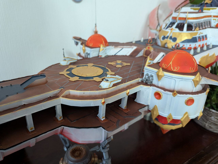 Вся покраска, долгими зимними вечерами и с перерывами порой по паре месяцев, у меня заняла примерно два года. Когда основные детали были готовы, возник вопрос - а что делать с парусами? В игре у всех астральных кораблей паруса сделаны из некоего полу-прозрачного материала с хексагональным узором. Для начала я думал их тоже напечатать из прозрачной смолы, но по мере экспериментов понял, что затея эта крайне такая-себе. Напечатанные паруса легко рвались, имели следы поддержек и с ними было крайне сложно работать. Но в один прекрасный день я увидел свое спасение - пластиковые подложки для холодильника в рулоне. Изначально нужны что-бы всякие аджики растекаясь по холодильнику не текли на стекло и пластик, а оставались на таком легко доставаемом и заменяемом материале, а мне они идеально подошли для парусов, так как имели тот самых хексагональный узор.