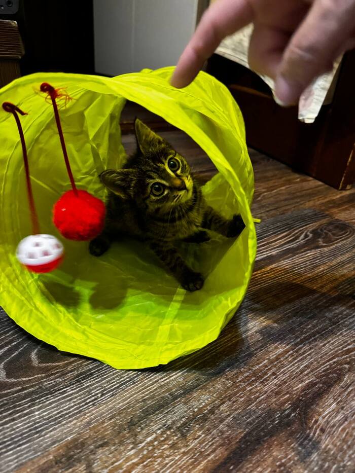 Мальчик, 3 месяца, к лотку приучен. Игривый, контактный, ест всё (мясо, корм, иногда пальцы). Котенок активный, самостоятельный, любит спать рядом с человеком.