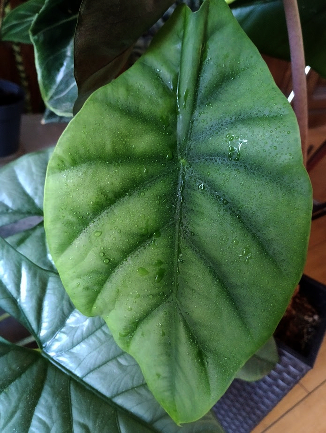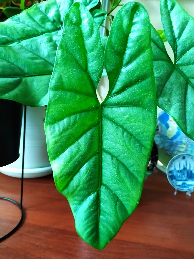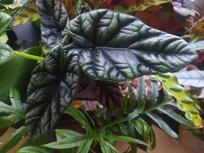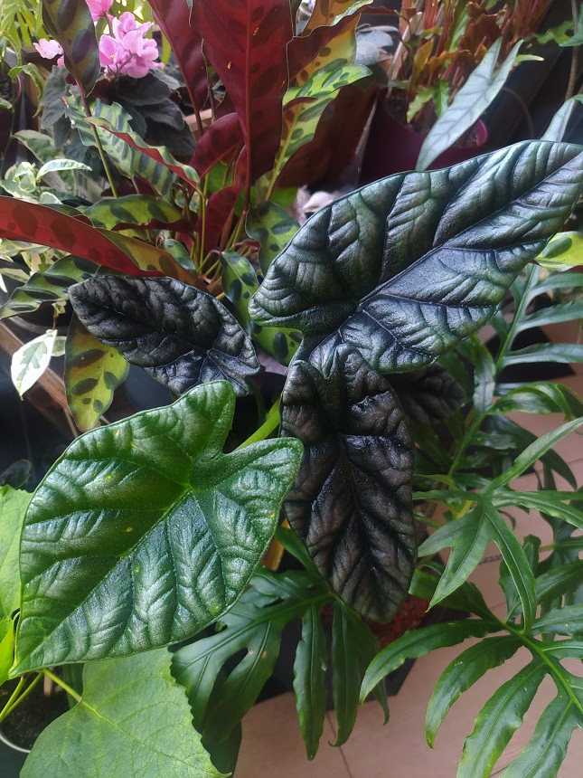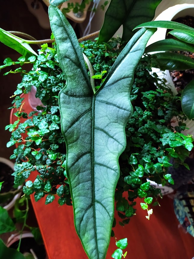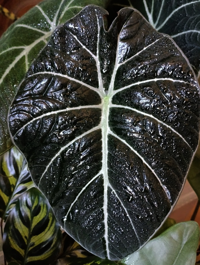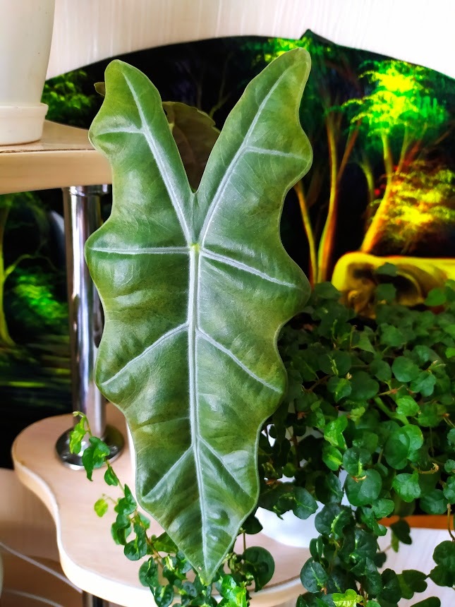 В то же время её соседка алоказия Блек Вельвет жадничая на новые листы, наращивает плотность, объём и насыщенность цвета листьев. Взяв в руку лист, можно подумать, что это мягкий, но достаточно плотный пластик.)